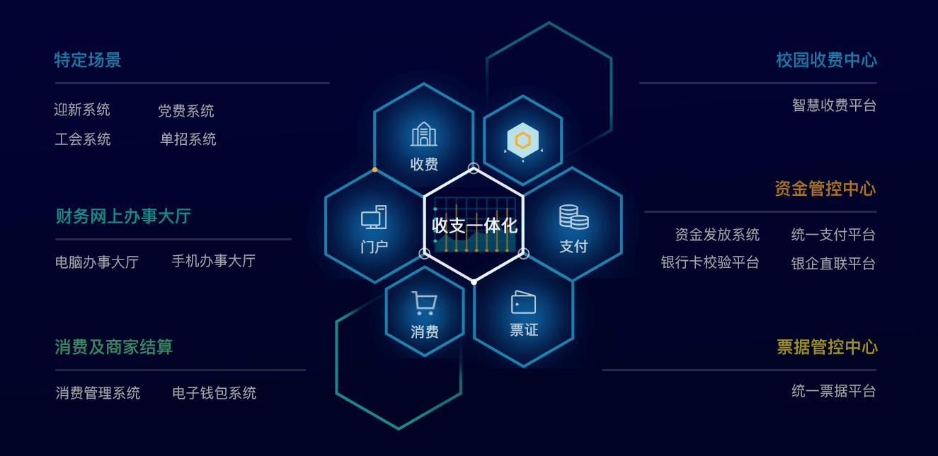 围绕收支一体化核心管理,延伸出5条核心业务线,17个软件产品,满足不同场景下的业务管理需求