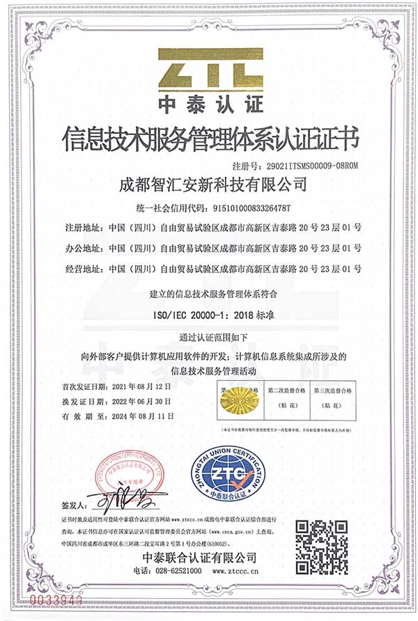 (ISO20000信息安全管理体系认证证书)
